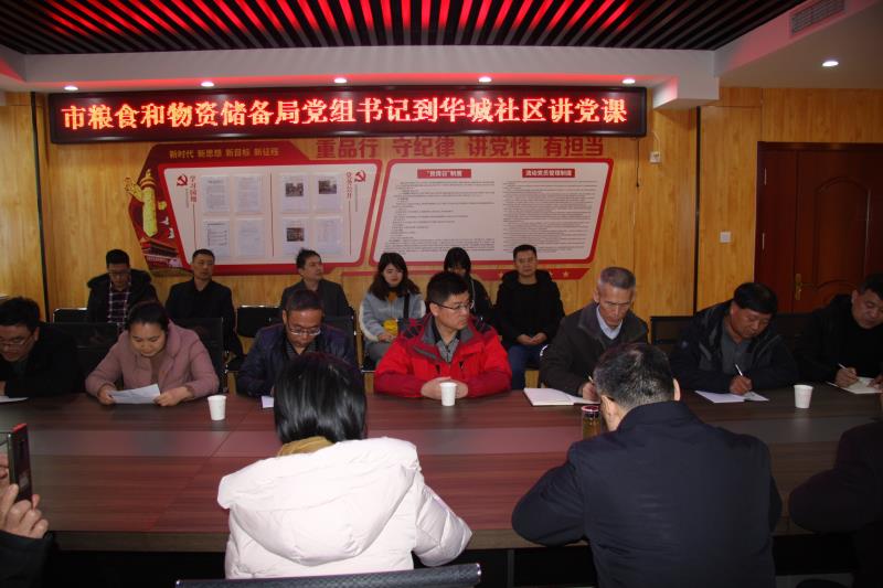 11月29日下午,临沂市粮食和物资储备局党组书记、局长范宝杰到“双报到”社区--兰山区华城社区讲党课,范宝杰同志紧密结合党史和临沂实际,突出政治性、实效性,紧密结合学习党的十九届四中全会精神的体会,以“坚定理想信念,勇于担当作为,全面开创新时代党建工作新局面”为题,讲解了我们党自成立之日起,到中国特色社会主义的新时代,把共产主义确立为远大理想的历程,使在座的党员群众进一步加深了对坚定理想信念重要性的理解。坚定理想信念是我党发展的根基,是我们党不断取得成功的力量源泉,是共产党员奋勇向前的精神动力,是共产党人先进性和纯洁性的集中体现,是应对“四大考验”“四大危险”的重要法宝,是做好新时代党建工作的必然要求。全体党员要“守初心、担使命,找差距、抓落实”,认真学习党的十九届四中全会精神,用习近平新时代中国特色社会主义思想武装头脑,干事创业敢担当、为民服务解难题、清正康洁作表率,落实新要求,实现新作为、展示新形象。课后,市粮食和物资储备局党组为社区党员群众赠送了党的十九届四中全会精神学习资料,并进行了调研座谈。双方就“双报到”工作进行了交流,“双报到”工作既密切了党群关系,也增强了党员干部的责任意识,丰富了社区的精神文化生活,使社区居民感受到党和政府的温暖。兰山街道党工委书记房庆良、组织委员杜海霞,华城社区红领书记赵元平、华城社区党总支书记姜兆印,市粮食和物资储备局党组成员、机关全体党员及部分群众参加了活动。