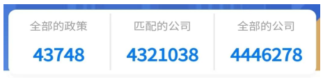 在 政 策 统 计 区 ,“ 全 部 的 政 策 ”“ 匹 配 的 公 司 ”“全部的公司”三个数据项分别统计了该平台已收录的惠企政策数量、平台中的政策可匹配的省内企业法人单位数量、平台企业库中省内全部的企业法人单位数量。