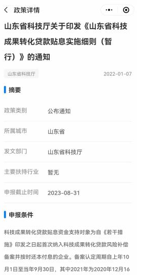 点击任意一个政策,即可进入到政策详情页面。上半部分提取出来的摘要信息,包括政策类别、所属城市、发文部门、主要扶 持行业、申报截止时间、申报条件、扶持内容、申报材料。可以方便直观的了解到该政策的重点内容。下面则是该政策的全文,方便详细了解本政策的全部内容。