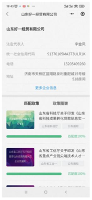 在企业搜索框输入企业名称,然后点击搜索按钮,即可跳转到企业匹配页面,此页面上半部分展示的是该企业的工商基本信息,下半部分展示的是匹配到该企业的政策,并且按照匹配度进行了由高向低的排序。