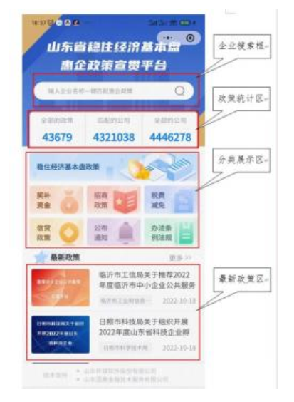 通过扫描屏幕上的二维码,或搜索“山东惠企服务平台”,即可进入小程序,首页设置有“企业搜索框”“政策统计区”“分类展示区”“最新政策区”四个主要模块,企业信息匹配快捷,各类政策清晰明了。