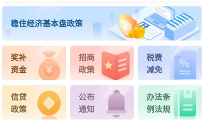 在分类展示区,按照政策类型,将已收录的政策分为稳住经济基本盘政策、奖补资金、招商政策、税费减免、信贷政策、公布通知、办法条例法规等 7 大类,进行归类汇总。企业只需点击其中的一个分类图片即可跳转到政策列表页面。