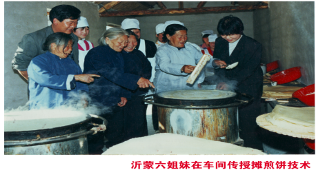 公司在创建伊始,就聘请在革命战争年代踊跃支前而闻名全国的“沂蒙六姐妹”担任名誉厂长,并以“六姐妹”“沂蒙六姐妹”在国家商标局注册商标。消费者从品尝六姐妹煎饼,了解到支前老模范无私奉献、可歌可泣的动人事迹,形成了“六姐妹”所特有的饮食文化,从而形成了生产、销售的同步增长、快速发展。2002年,“六姐妹”商标荣获山东省著名商标;2005年,“六姐妹”牌煎饼荣获山东省名牌产品荣誉称号;2007年被临沂市人民政府授予“农业产业化市重点龙头企业”;2008年,六姐妹煎饼被省技术监督局批准为全省执行的地方性标准,同年,被山东省妇女联合会授予“省优秀妇女专业合作组织”;2011 年,“六姐妹”煎饼荣获“山东老字号”产品荣誉称号;2013年被蒙阴县妇联授予“蒙阴县关爱困难妇女儿童爱心集体”,2016年被山东省妇女联合会授予山东省巾帼居家创业就业脱贫行动“大姐工坊”。2017年被山东省女企业家协会授予“山东省女企业家协会理事单位”,2018年被山东省老区建设促进会授予“巾帼扶贫示范基地”。经过多年的不懈奋斗,“六姐妹”牌煎饼先后被《人民日报》、《农民日报》、《临沂日报》、《南方都市报》、《大众日报》、中央电视台、山东电视台、齐鲁电视台等几十家新闻媒体报道,成为全省最大的煎饼加工企业。