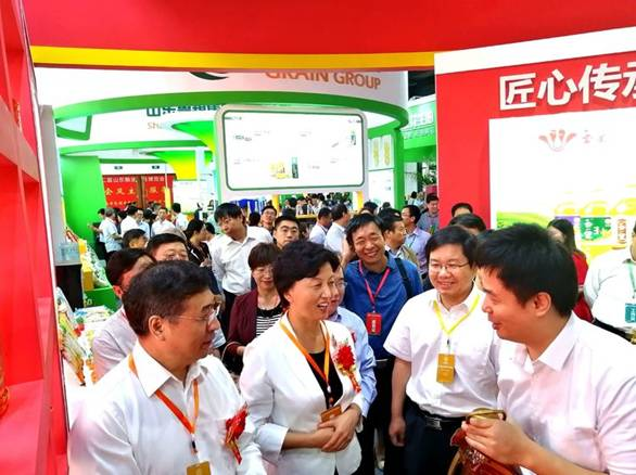 国家粮食和物资储备局副局长韩卫江、省粮食和物资储备局局长王伟华、临沂市粮食和物资储备局局长范宝杰与山东玉皇粮油食品有限公司总经理张永琥在展会上交流。