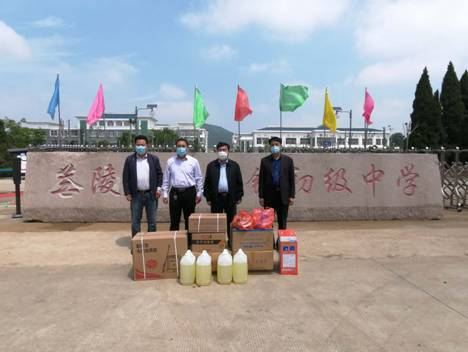 为深入贯彻落实市委新冠肺炎疫情处置工作领导小组(指挥部)研究部署,做好学生开学复课后的疫情防控工作,2020年5月9日上午,受临沂市粮食和物资储备局党组书记、局长范宝杰委托,兰陵县尚岩镇市县联合工作组在组长张洁副局长的带领下,到兰陵县尚岩镇初级中学捐赠了我局筹措的一批防疫物资(口罩1000个、84消毒液4桶、喷雾器4个、酒精湿巾2箱、电子测温计15个、免洗手抑菌凝胶2箱、一次性PE手套1000副、小喷壶10个)。尚岩镇党委副书记孟祥杰、学校校长杨友忠陪同参加捐赠仪式。