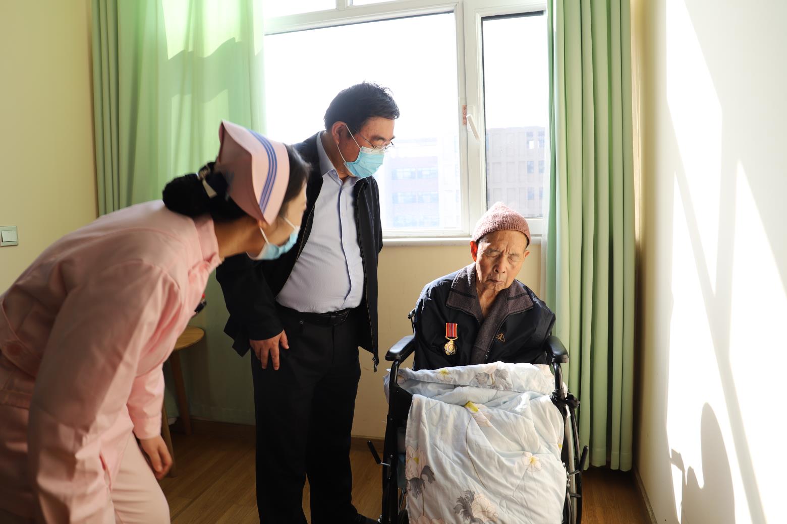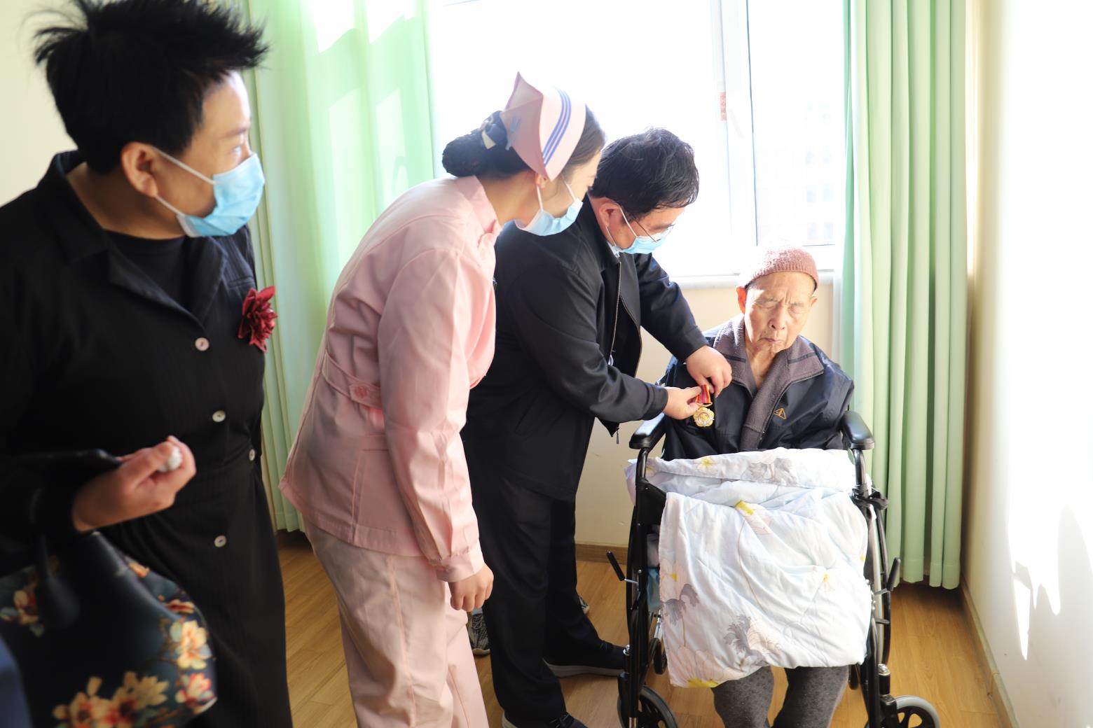 10月19日,临沂市粮食和物资储备局党组成员、副局长张洁,带领局机关科室工作人员走访慰问了抗美援朝老战士王万明。居住在兰山睿雅中医院养老中心的王万明,今年90周岁,1948年入伍,参加中国人民志愿军赴朝作战,在部队荣立三等功2次,团通报奖励1次。退役后在临沂地区粮食局(现临沂市粮食和物资储备局)工作。得知王万明老兵由于年事已高、因病休养的情况后,市粮食和物资储备局多次组织人员到王老家中进行走访慰问。张洁同志与其家属亲切交谈,详细询问老人的身体状况和生活起居,感谢老人为祖国和人民作出的贡献,并亲自为王万明同志戴上了中国人民志愿军抗美援朝出国作战70周年纪念章。