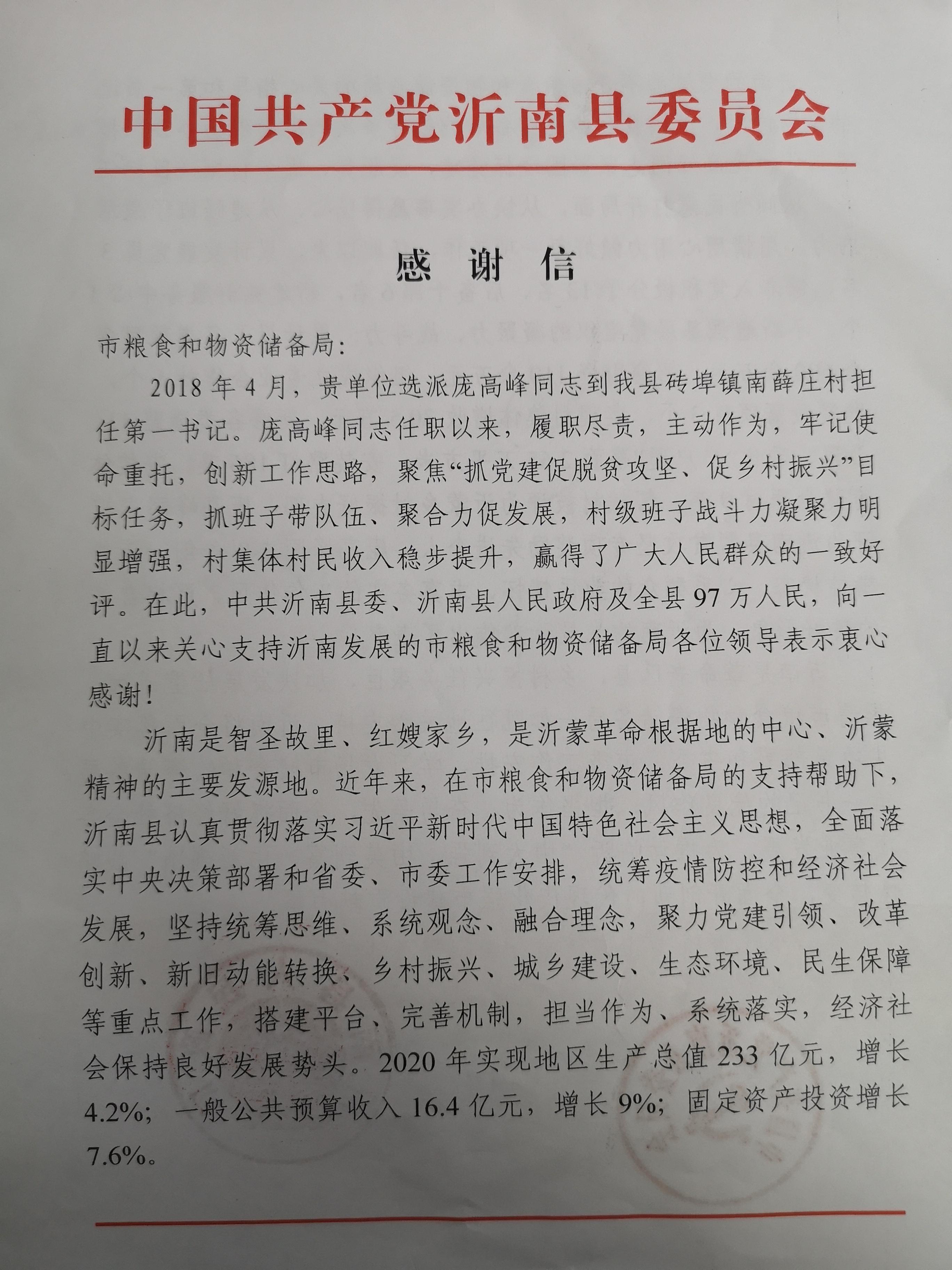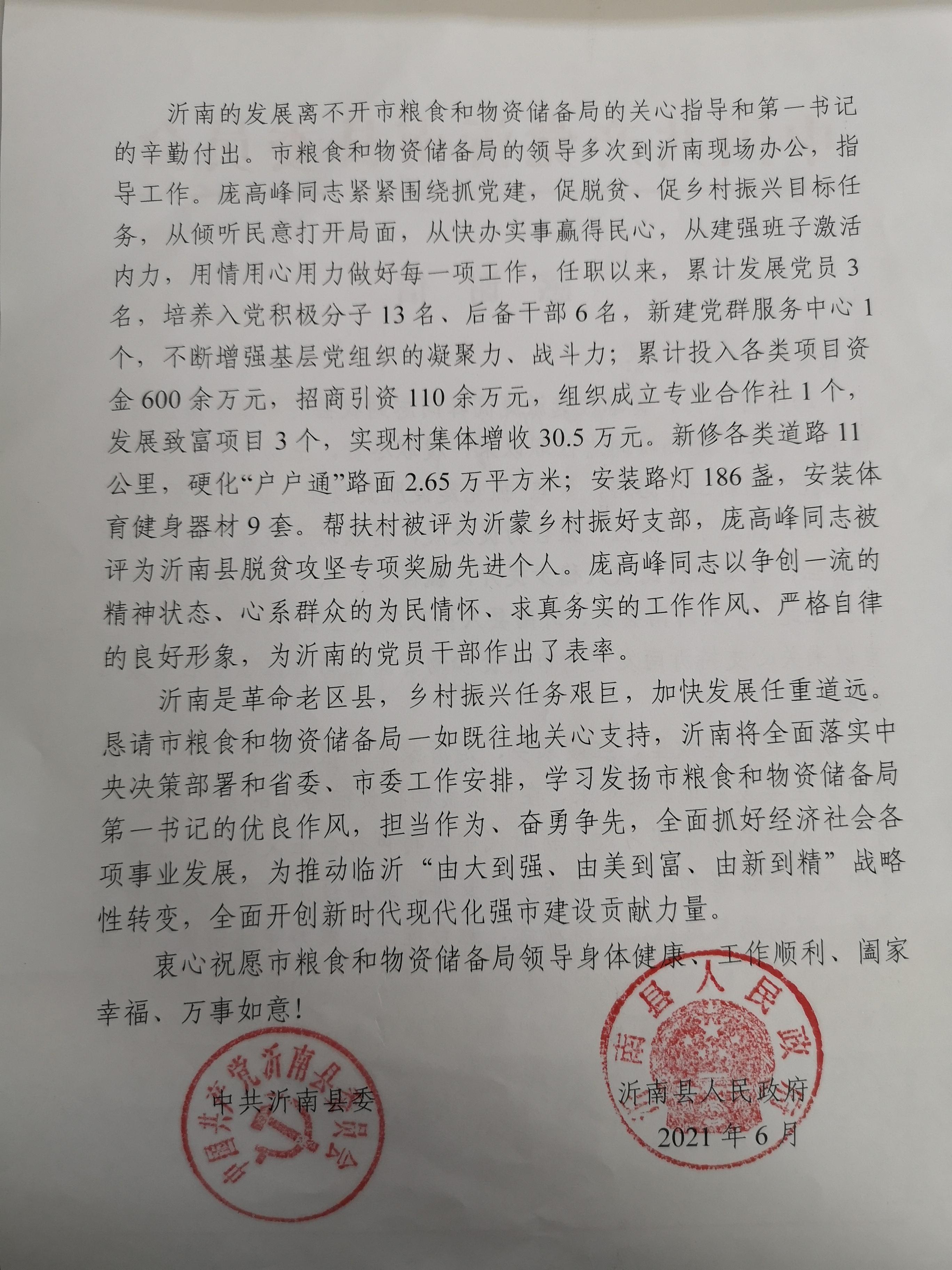 张一凡同志表示,选派优秀干部到村任第一书记是加强基层组织建设,培养锻炼干部、服务群众的有效途径,市粮食和物资储备局选派的第一书记庞高峰同志,牢记使命重托,抓班子带队伍、聚合力促发展,为村民办成了不少好事实事难事,赢得了广大人民群众的一致好评,同时希望市粮食和物资储备局能够一如既往地关心、支持、帮助沂南,多来检查指导,支持沂南发展。