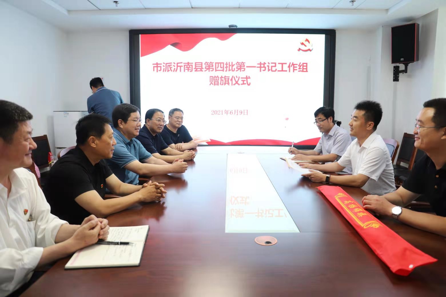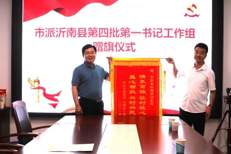 6月9日下午,市派沂南县第四批第一书记大组长张一凡、沂南县选派办副主任刘庆合,砖埠镇党委副书记朱成龙等一行5人将一面印有烫金字“情系百姓驻村驻心 真心帮扶兴村兴民”锦旗和一封感谢信赠送我局,感谢我局及派驻第一书记庞高峰对沂南县砖埠镇南薛庄村的关心和帮助。局党组书记、局长范宝杰,党组成员、副局长徐景亮等同志参加赠旗活动。