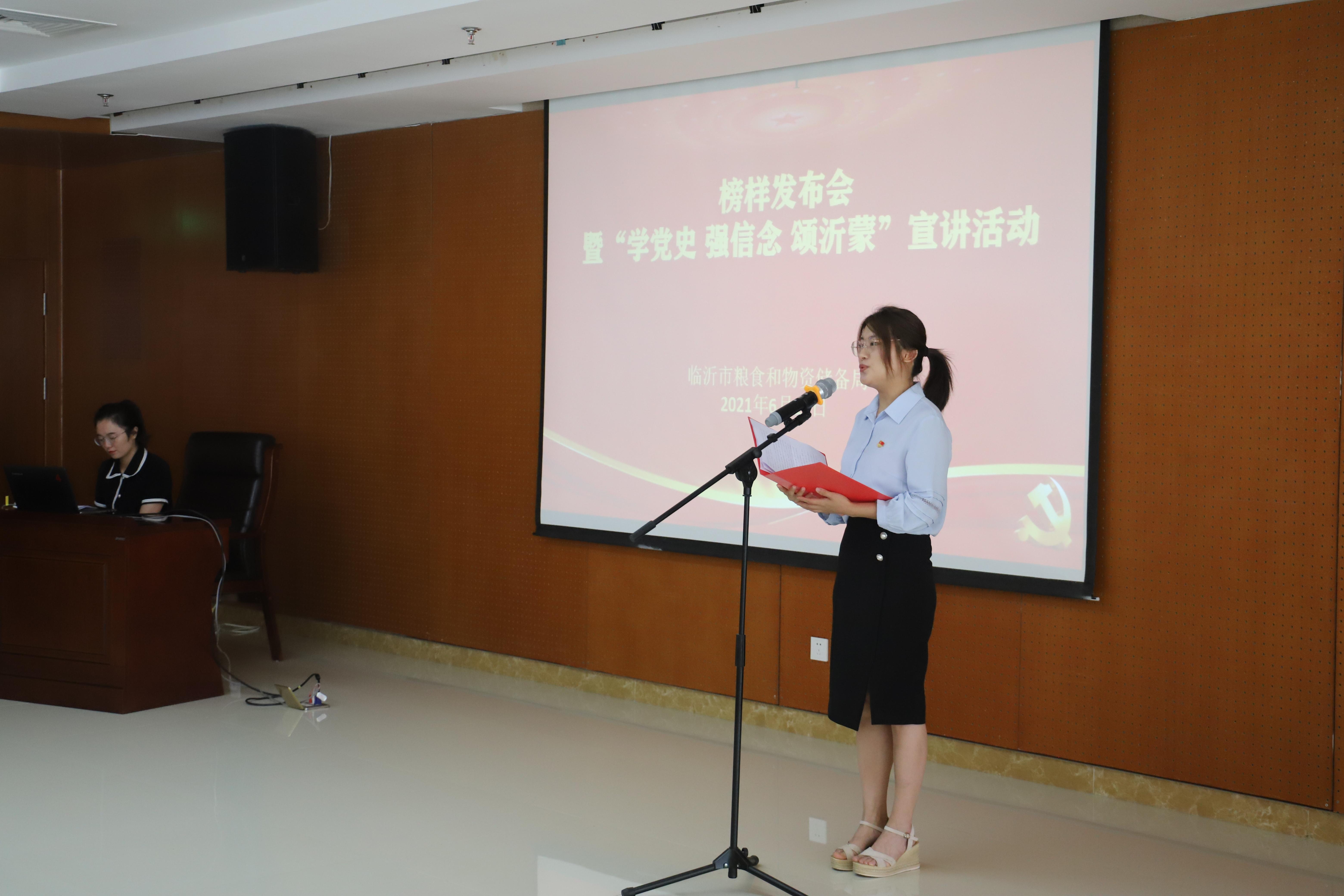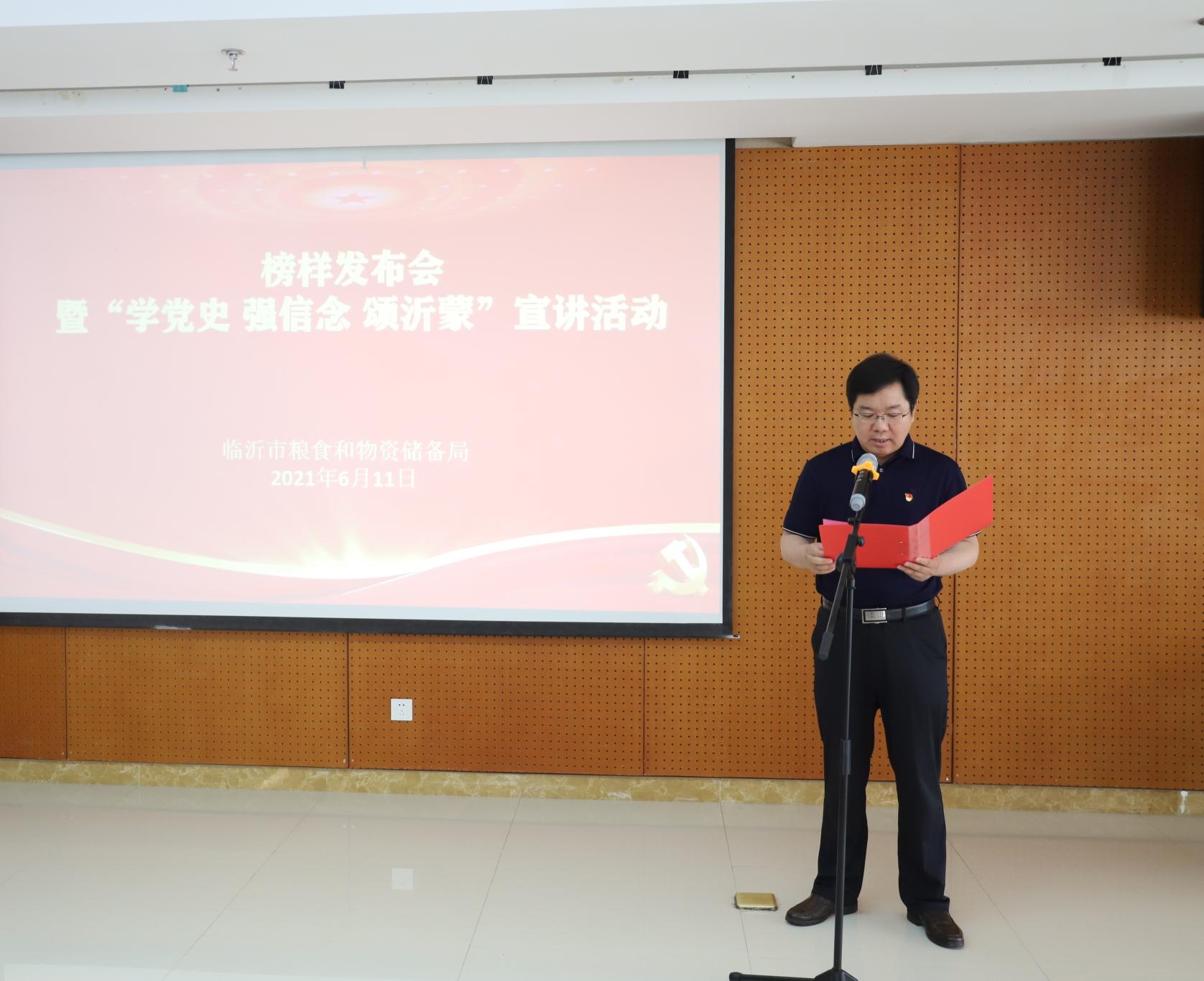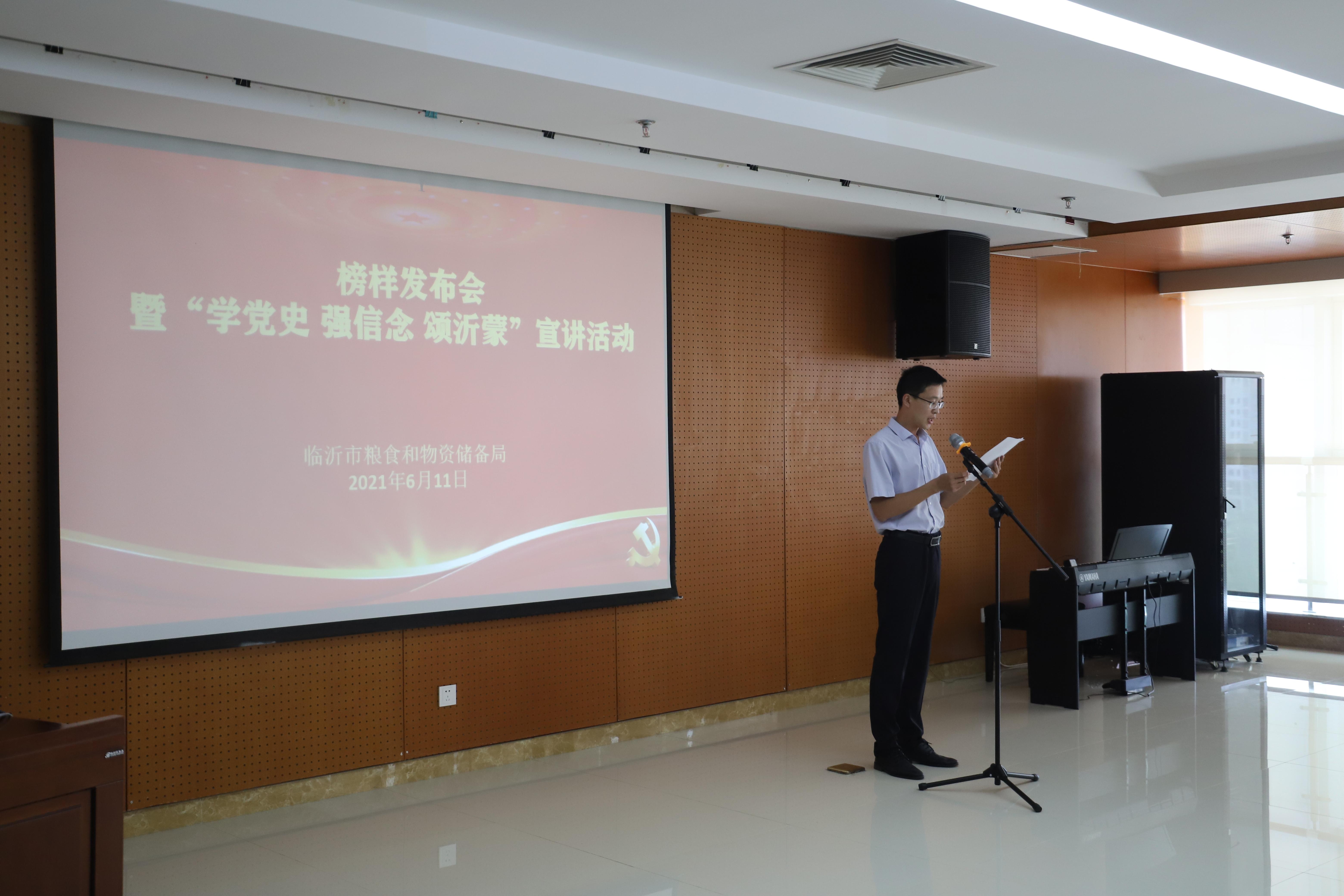 为庆祝建党100周年,深入传承红色基因,全面展示全市粮食和物资储备系统在革命、建设、改革、发展中取得的丰硕成果,6月11日上午,市粮食和物资储备局组织全市粮食和物资储备系统榜样发布会暨“学党史、强信念、颂沂蒙”宣讲活动。