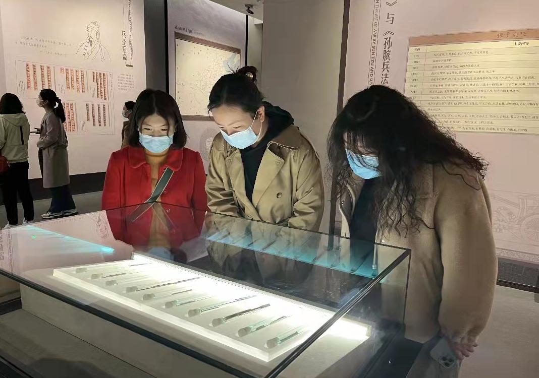 银雀山汉墓竹简博物馆位于山东省临沂市兰山区银雀山西南方的山脚下,是全国第一座汉墓竹简博物馆。馆内藏有1970年以来发掘出土的7500余枚以先秦兵书为主要内容的竹简,包括《孙子兵法》、《孙子佚文》、《孙膑兵法》论政、论兵文章等,被评为20世纪100年100项考古大发现之一、中国九大“镇国之宝”之一。 女职工们来到博物馆,参观了管内展出的竹简、《孙子兵法》线状四卷插图本和其他文物。
