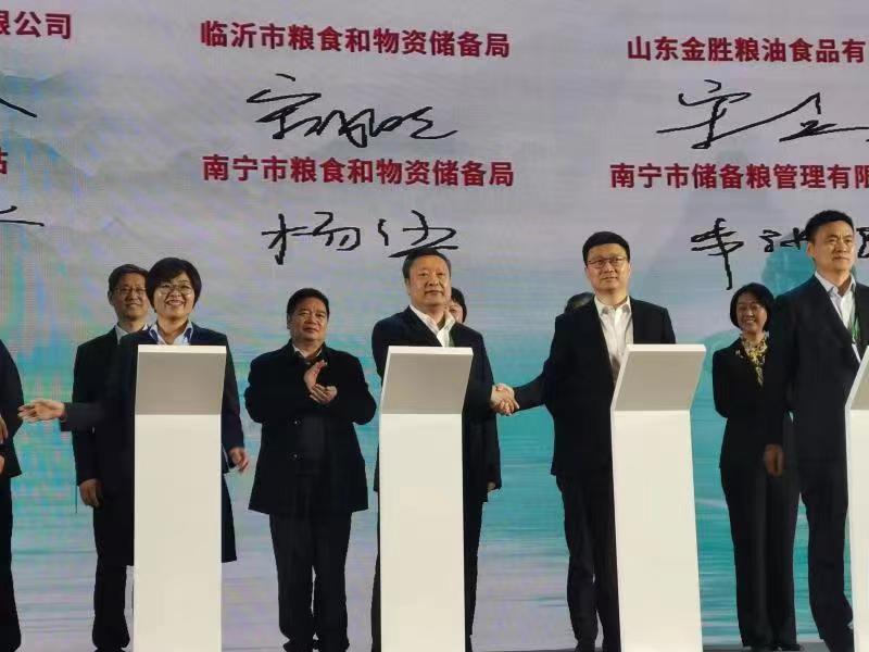 推介会上,宋成明同志接受了山东省广播电视台“品牌山东”专访和嘉宾访谈,就临沂市推动粮油产业高质量发展情况做了相关介绍,重点向广西人民推介了“沂蒙花生油”。山东省粮食和物资储备局党组书记、局长王伟华,广西壮族自治区粮食和物资储备局党组成员、副局长韦尚英等领导莅临我市粮油企业展位,对金胜、玉皇、兴泉、信合、迪雀等品牌粮油产品进行了品鉴,给予高度评价。金胜粮油食品有限公司推介了企业情况和明星产品。在两省区粮食和储备部门领导的共同见证下,临沂市粮食和储备局与南宁市粮食和储备局现场签约,达成产销合作协议;我市参展企业与广西客商现场签订花生油、玉米油购销协议,意向金额1.35亿元。