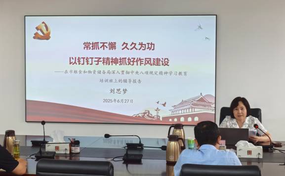 为推进深入贯彻中央八项规定精神学习教育走深走实,6月27日,市粮食和物资储备局举办深入贯彻中央八项规定精神学习教育专题培训班,邀请市纪委监委派驻第五纪检监察组组长刘思梦作专题辅导,党组成员、副局长朱佩清主持会议。